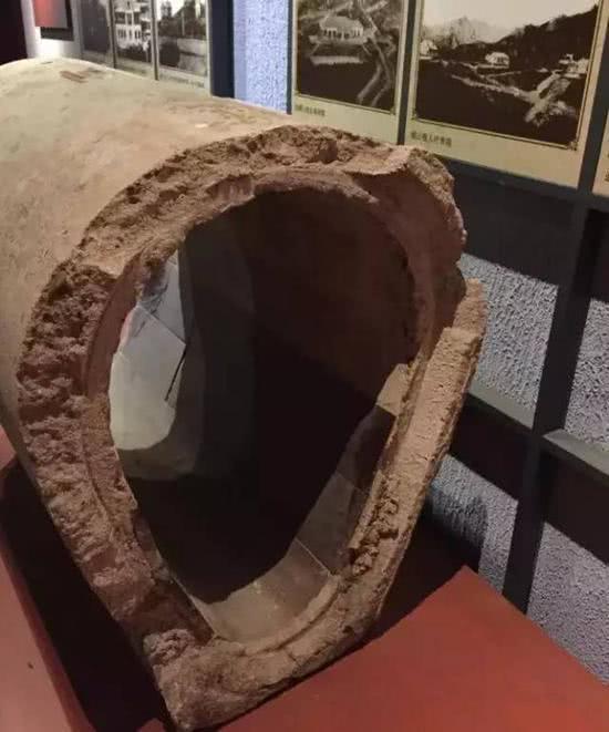 记者近日来到青岛市博物馆二楼,发现在《青岛史话》古韵悠长展区的展柜中,存放着一段德占时期的地下管道,高约80厘米、宽约40厘米,截面呈上宽下窄的鸡蛋形,下面较窄的半部分确实被贴上了暗红色的瓷片。