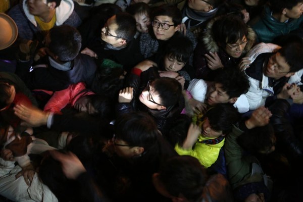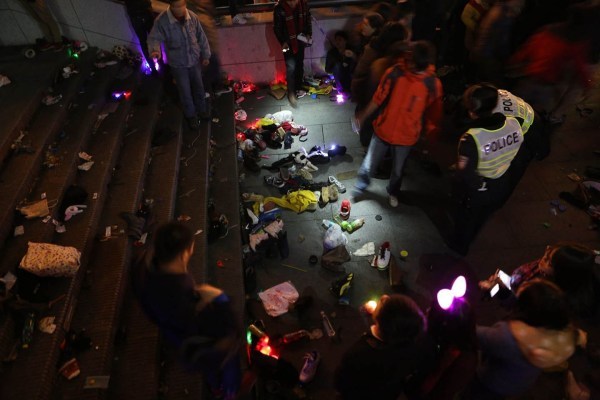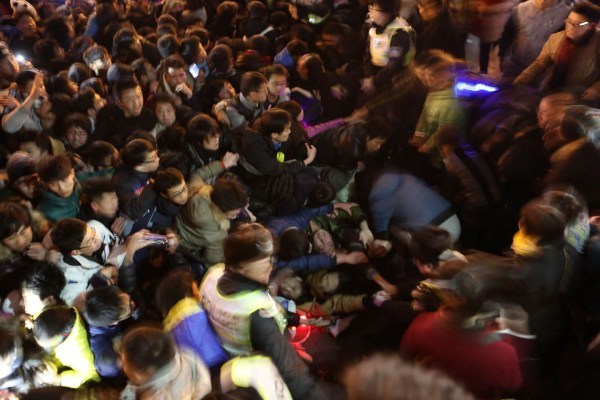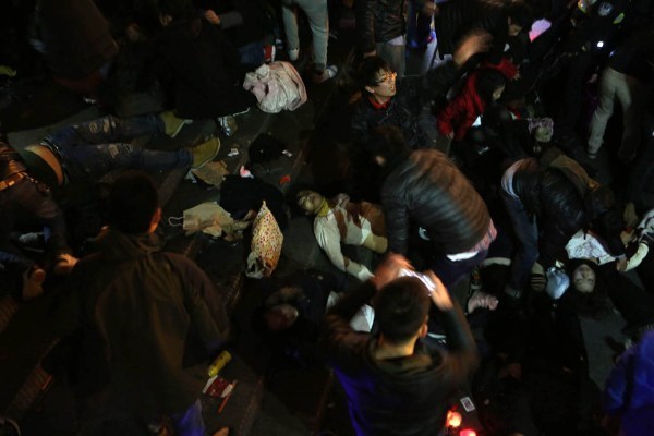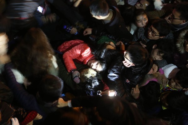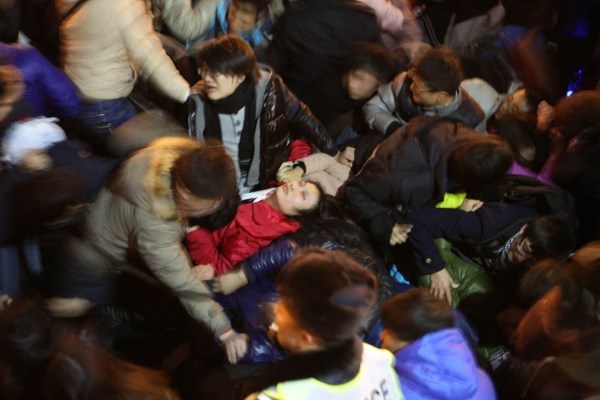 23:34分,楼梯最低处忽然有人被挤倒,附近人们一边试图拉起他们一边大声呼喊:不要再挤了!有人摔倒了!可惜的是这点声音都被淹没在上面不断涌下来的人群的嘈杂声里。于是,下面更多的人被层层涌来的人浪压倒,情势开始失控。 图/文 南都记者 郭现中